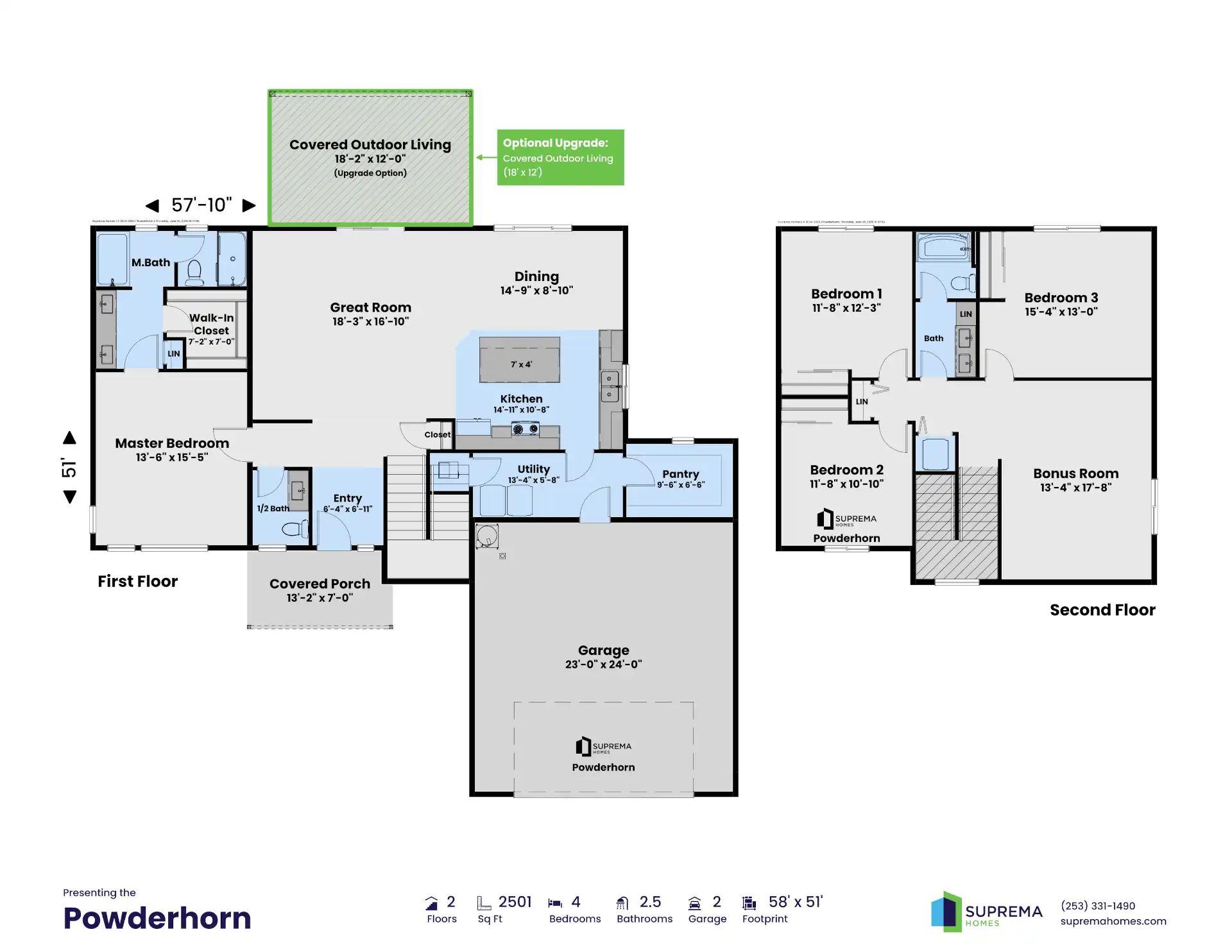 The Powderhorn was designed with a modern look and feel. You’ll enjoy a peaceful night’s rest in the 5-piece master suite located on the first floor with secondary bedrooms on the second floor. This plan boasts an enormous great room for family and friends to gather. Highly desired 9’ ceilings are standard throughout the first floor and contribute to the open and spacious feel. You’ll appreciate the large kitchen with its huge island for cooking prep and eating along with the spacious pantry. The second floor has 8’ ceilings and features an ample bonus room. The stackable washer/dryer location on the second floor is a thoughtful touch that makes life easier. As with all Suprema homes, this layout lives like a much larger house, with zero wasted space.
