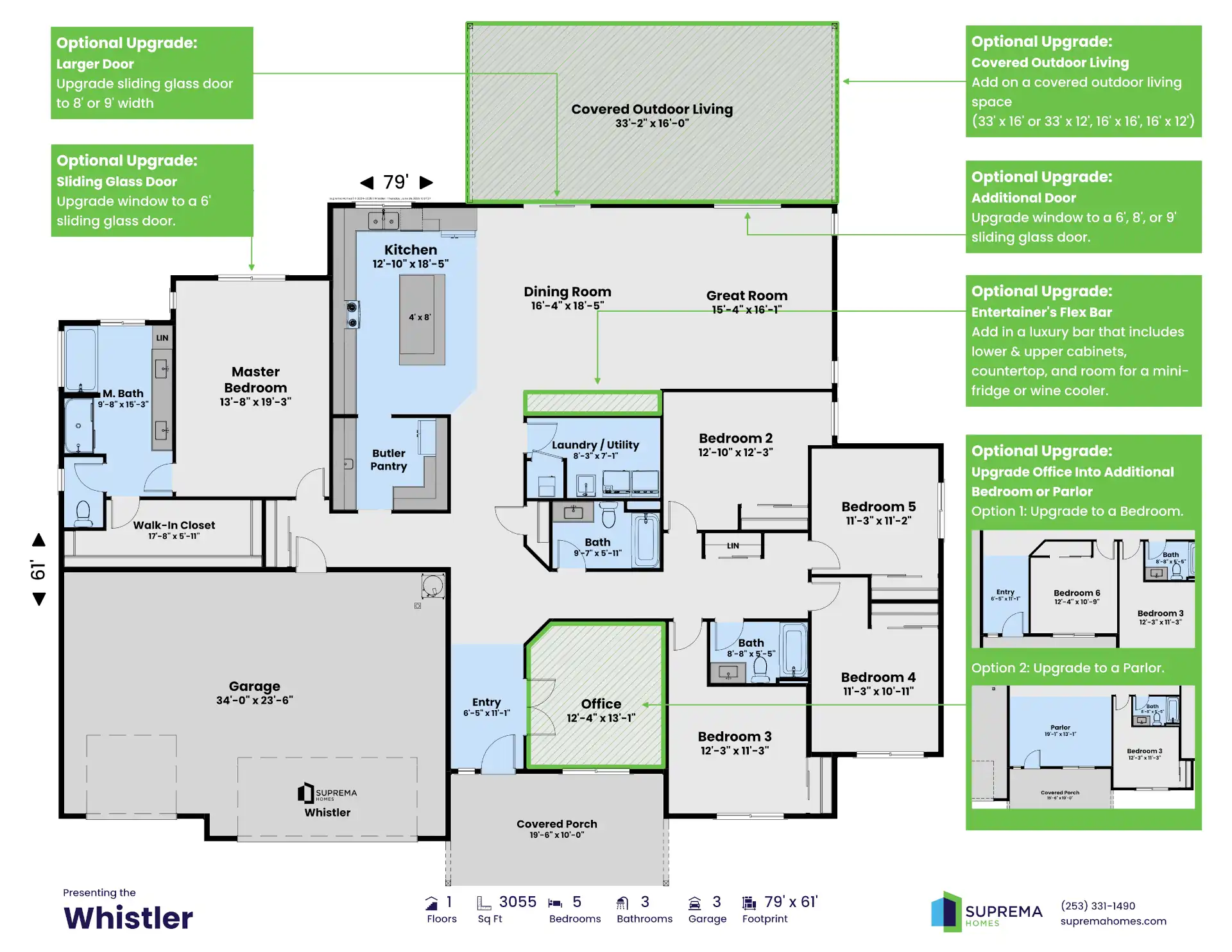 Whistler Exterior Whistler Floor Plan The Whistler floor plan features a spacious design with 9′ ceilings, a luxurious 5-piece master suite, a large great room, and an entertainer’s kitchen with a butler’s pantry and optional dining room upgrades.